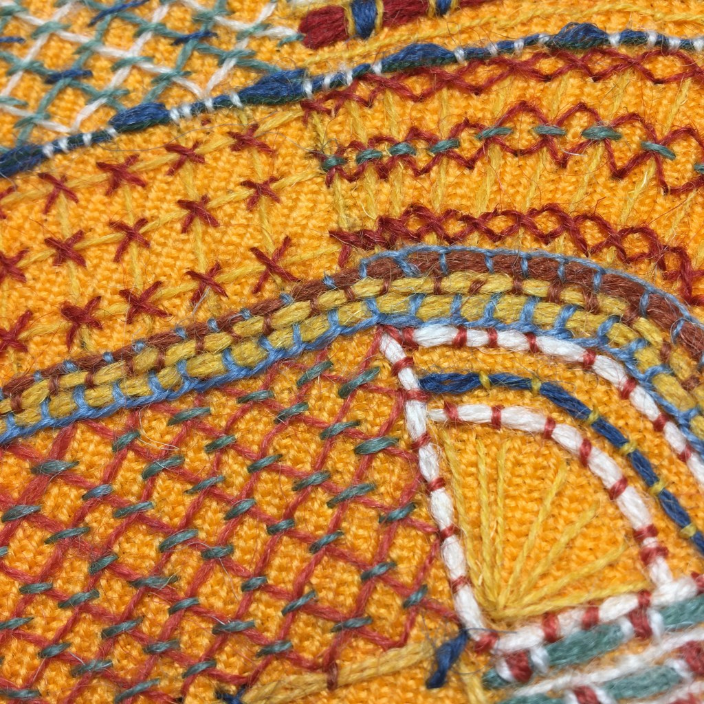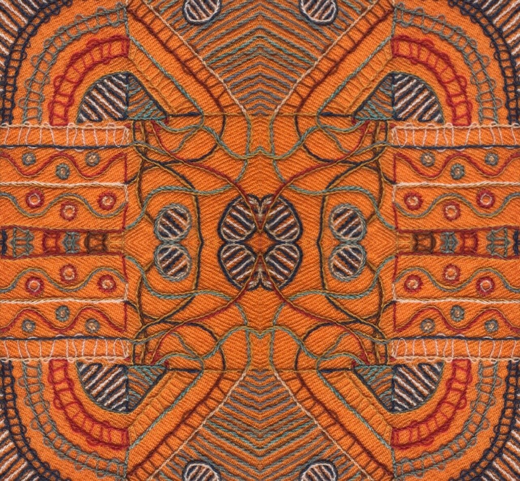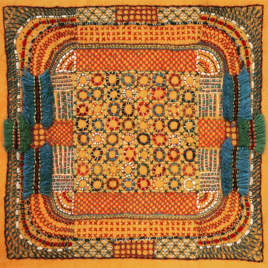 This is a project inspired by http://www.textileartist.org during the Lockdown Corona period February to May 2020 and also an extension of my original project studying folk art on wool . I used the tradition wool arriz shawl from the Pateh Doozi and hand dyed yarns . I made 6 samplers originally using stitches that are used in Pateh Doozi and then used App.Ollogy to create more intricate designs . I cannot put it down ! I usually need to feel the project has exhausted itself and comes to a natural end …. this is still on going!