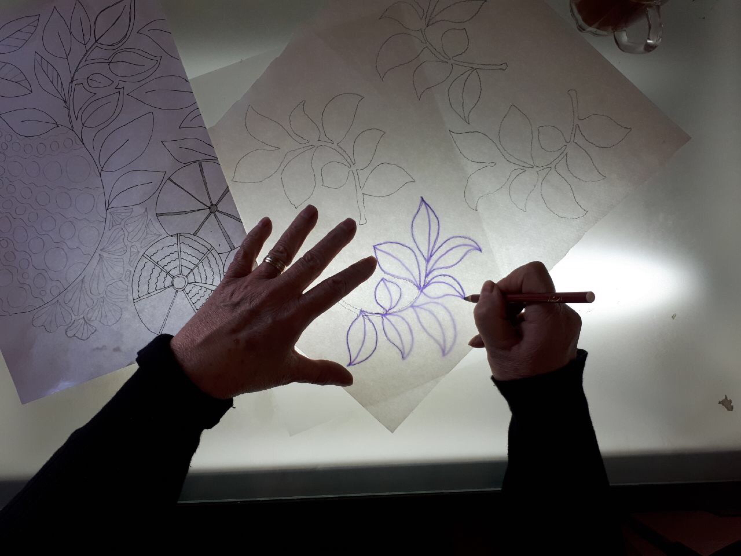 I began by drawing birds and flowers in order to get some shapes and designs that I can use later on .For me all design work starts from the drawing. With the use of App.Ollogy I can stylize and transform the … creating more drawings and designs .
