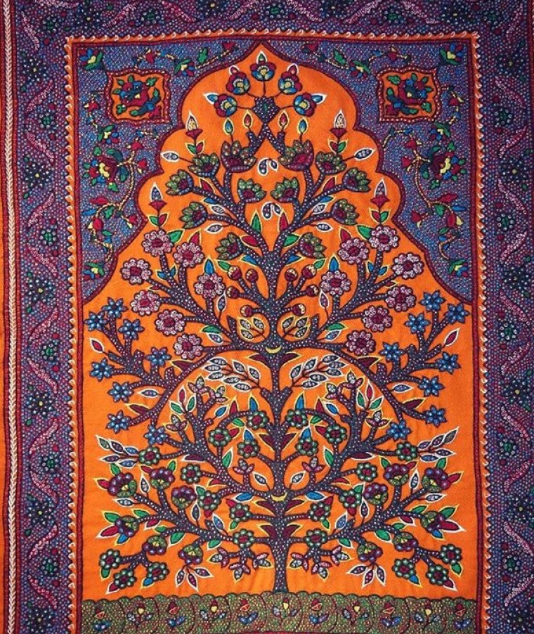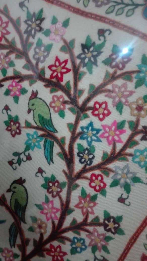 Pateh takes many of its designs from the famous Kerman carpets designs and similarity can be seen clearly as to a central mandala with borders. Kerman in situated in a dry desert plain and has severely cold winters and hot summers. Life is spent indoors and therefore the art and crafts have replaced flowers, gardens , birds etc… with their weaving and stitching and brought them into their homes.