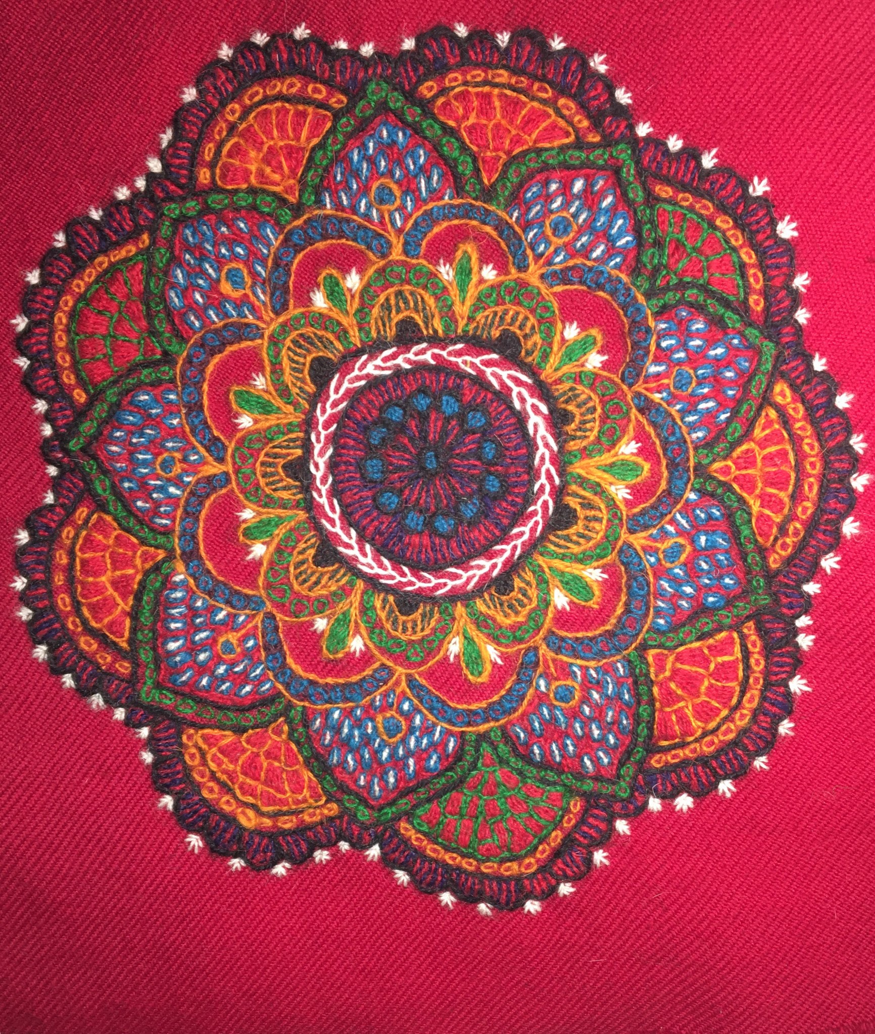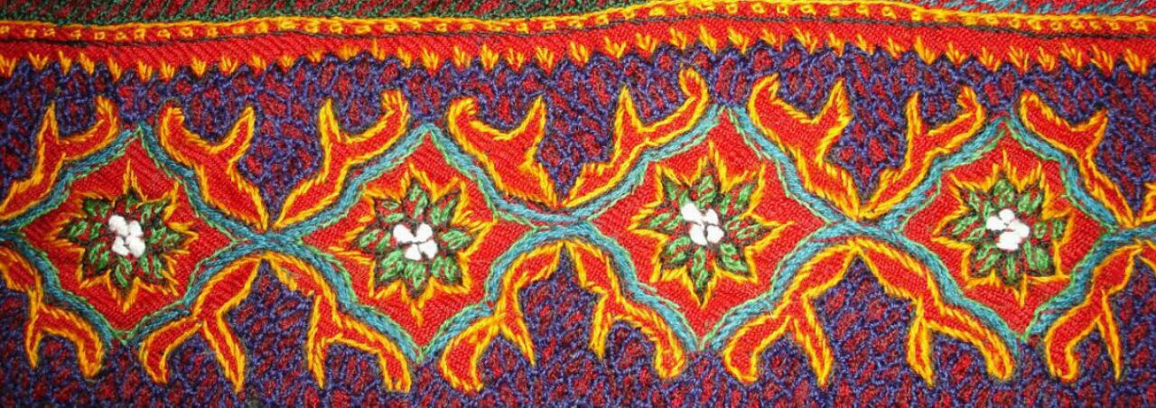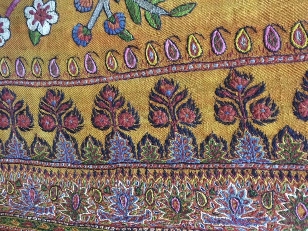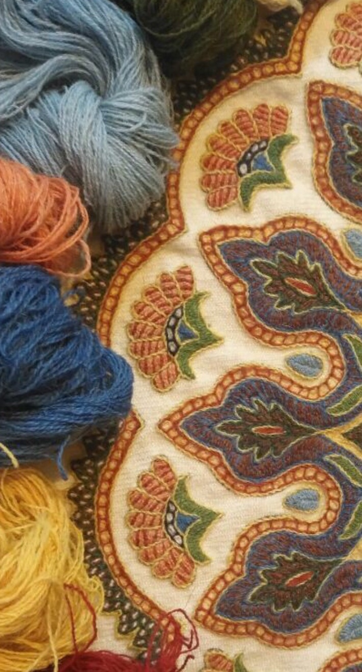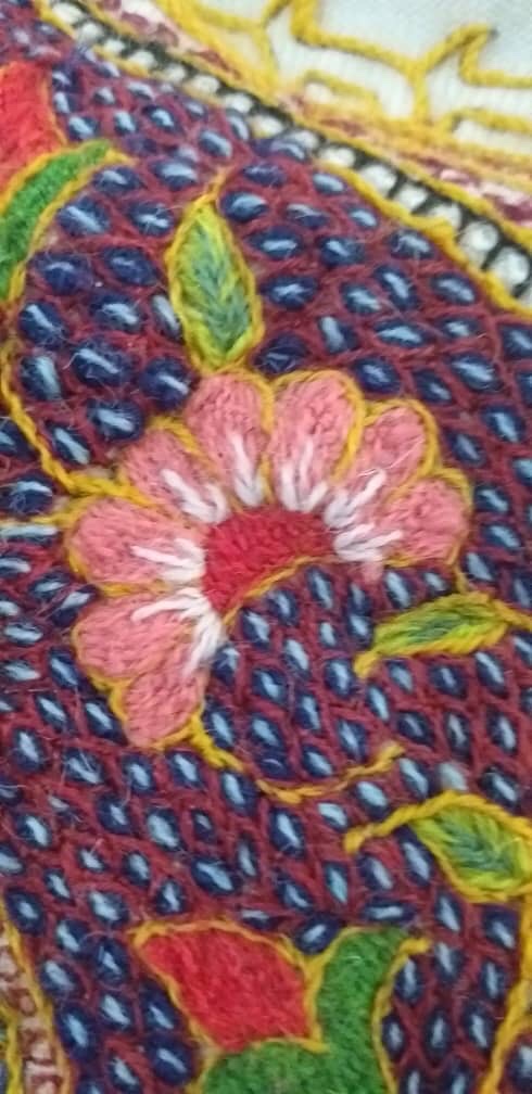 This is a project inspired by http://www.textileartist.org during the Lockdown Corona period February to May 2020 and also an extension of my original project studying folk art on wool . I used the tradition wool arriz shawl from the Pateh Doozi and hand dyed yarns . I made 6 samplers originally using stitches that are used in Pateh Doozi and then used App.Ollogy to create more intricate designs . I cannot put it down ! I usually need to feel the project has exhausted itself and comes to a natural end …. this is still on going!