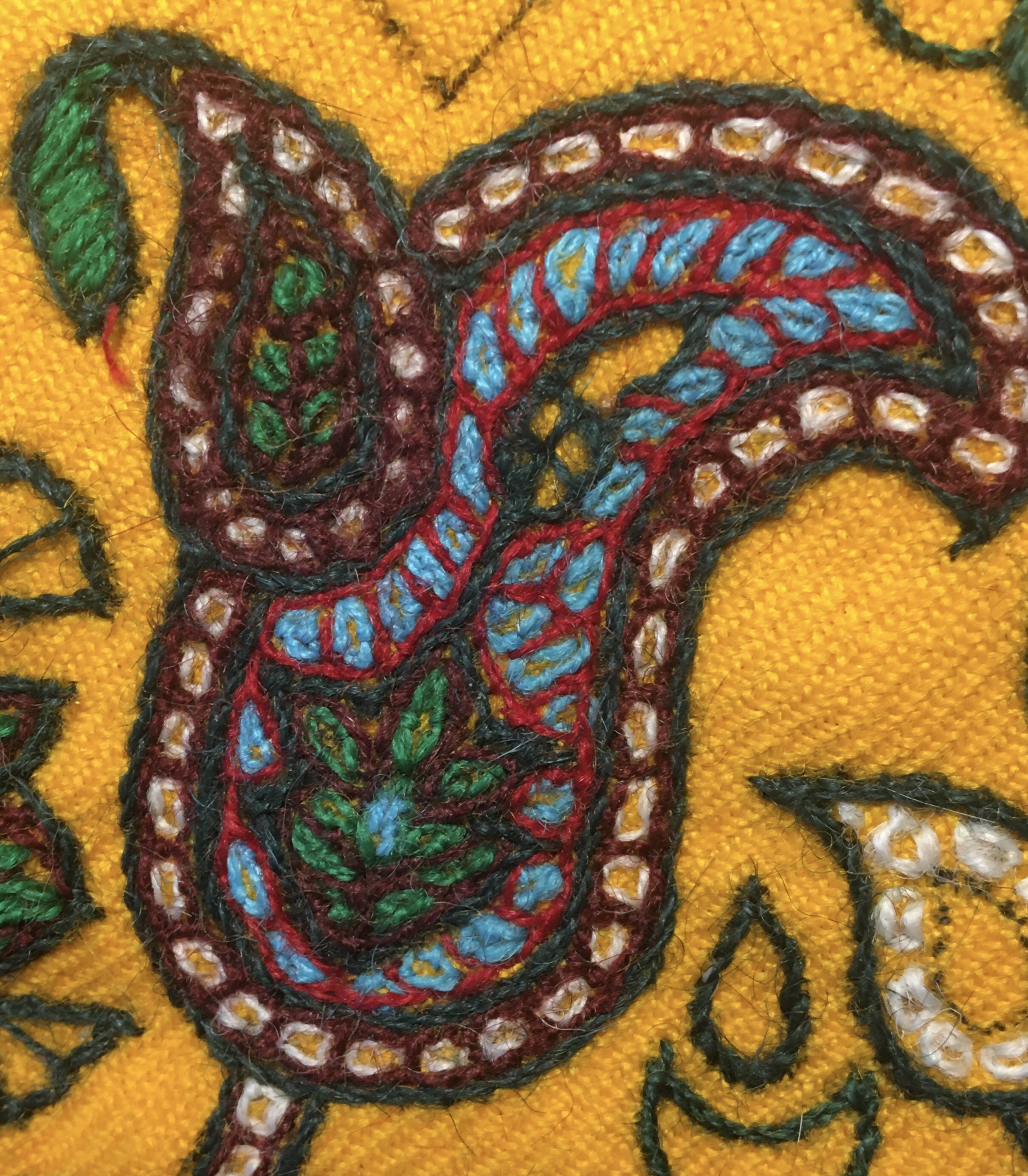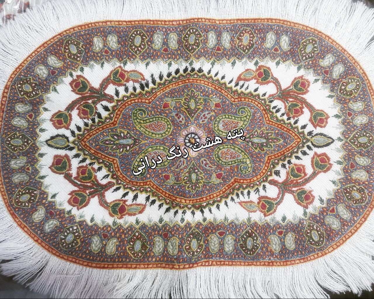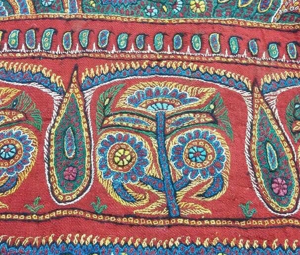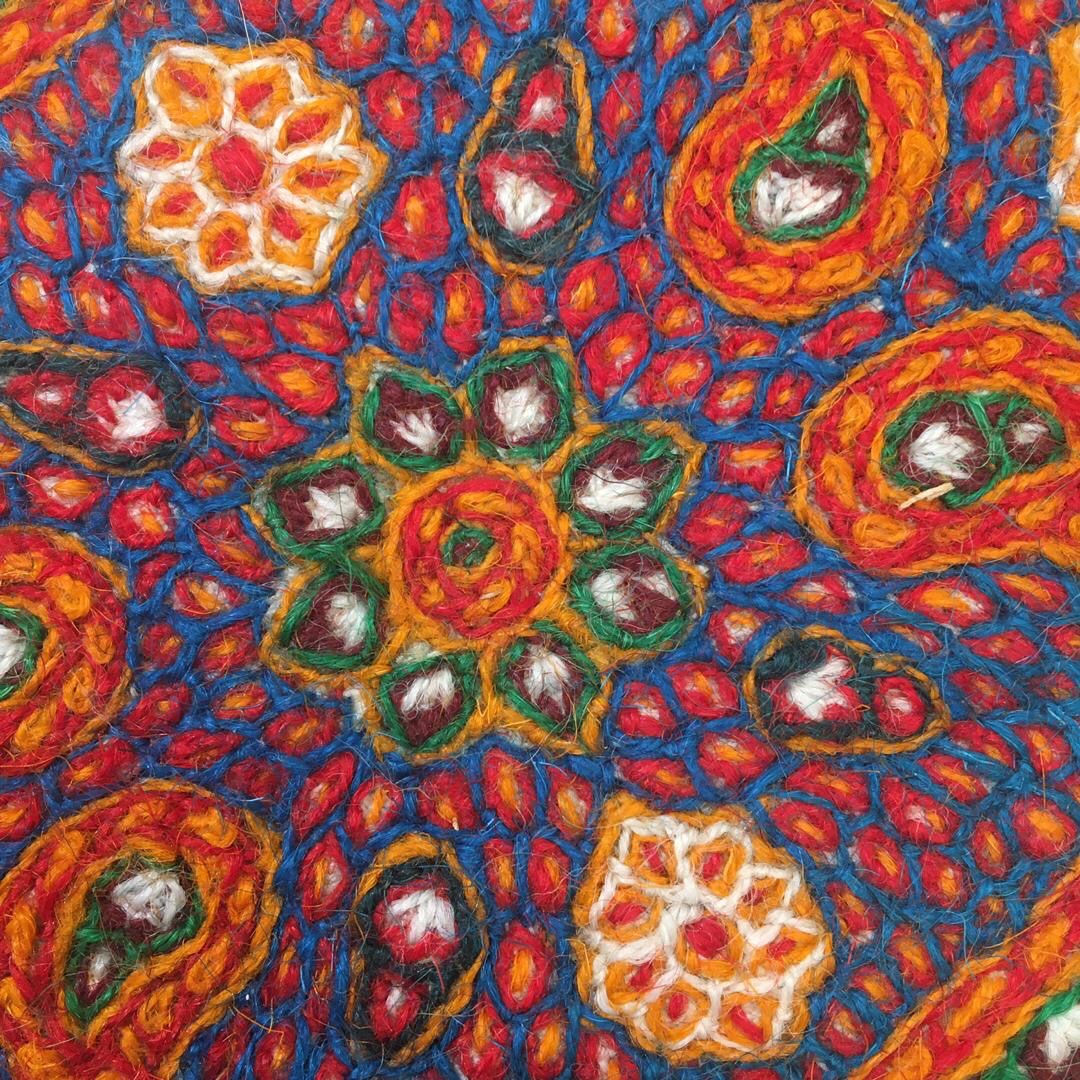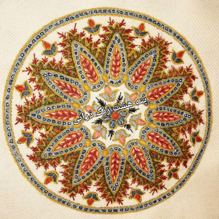 It is a folk art needlework which means that the objects usually have a practical use . There are 8 traditional colour yarns and is usually worked on a red or white background . Although in recent years working on orange , turquoise and navy backgrounds has become popular .The designs are traditional and most definitely have their origin in the carpert designs of the area.Paisley patterns بتجقه the central Toranj design and the Tree of Life are familiar designs used in Pateh Doozi .
