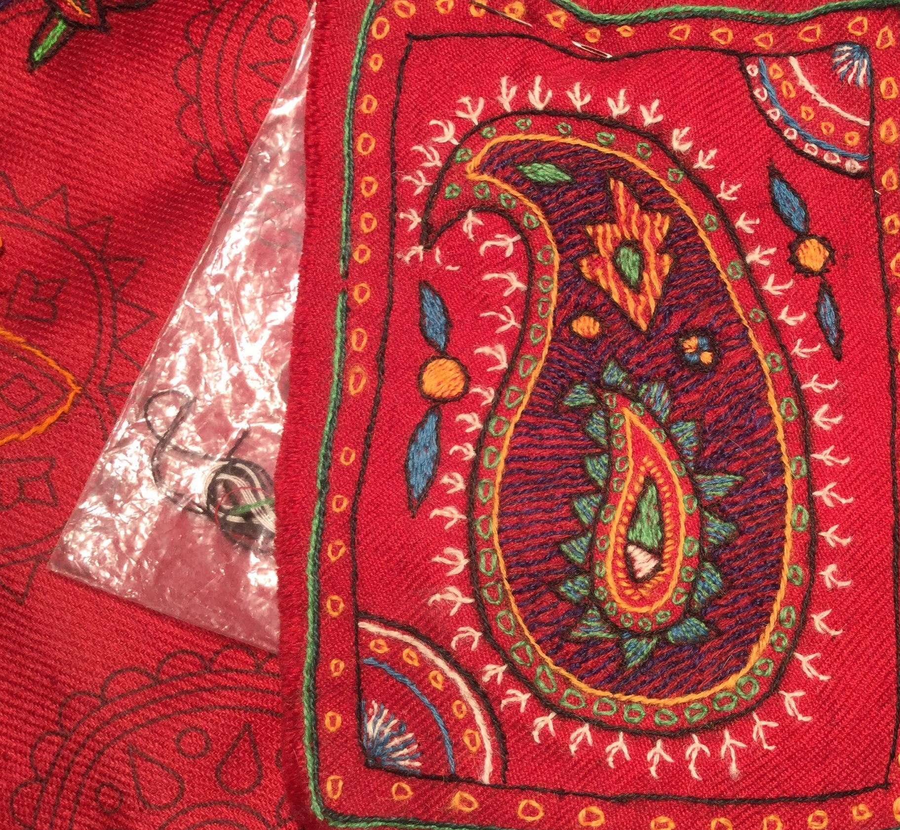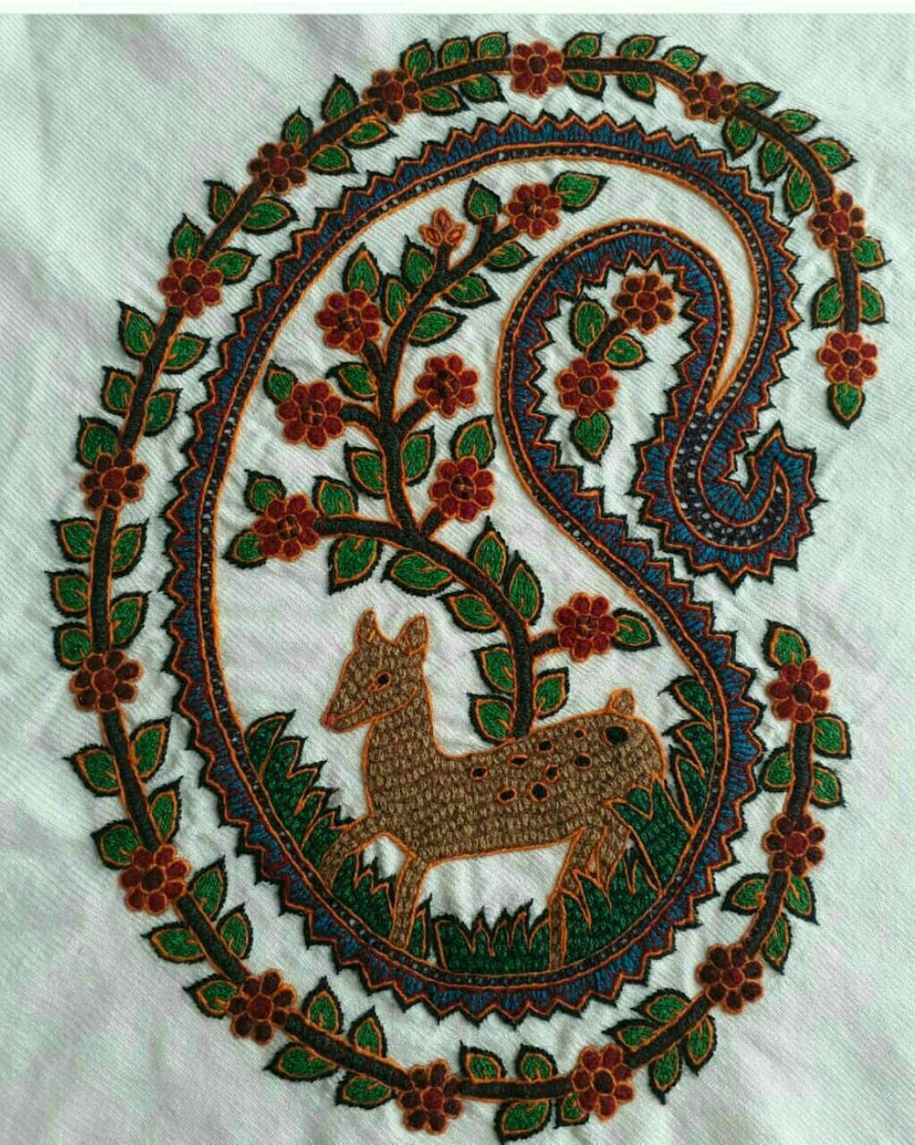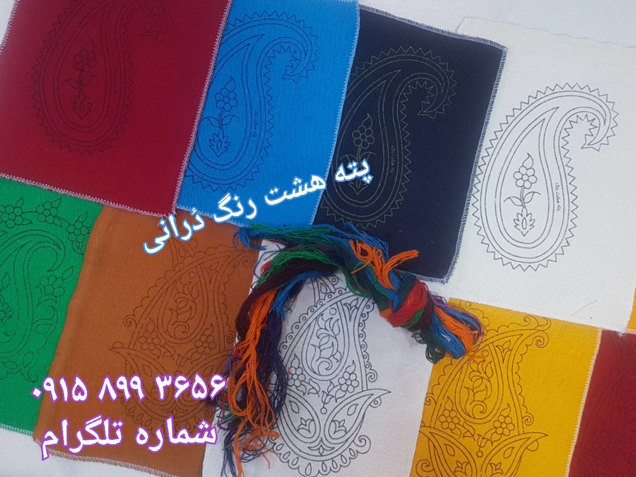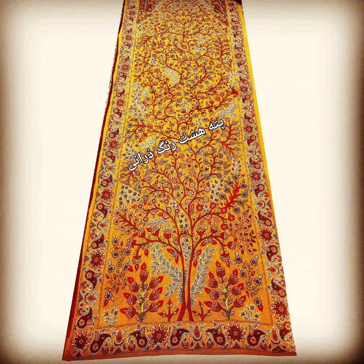 It is a folk art needlework which means that the objects usually have a practical use . There are 8 traditional colour yarns and is usually worked on a red or white background . Although in recent years working on orange , turquoise and navy backgrounds has become popular .The designs are traditional and most definitely have their origin in the carpert designs of the area.Paisley patterns بتجقه the central Toranj design and the Tree of Life are familiar designs used in Pateh Doozi .