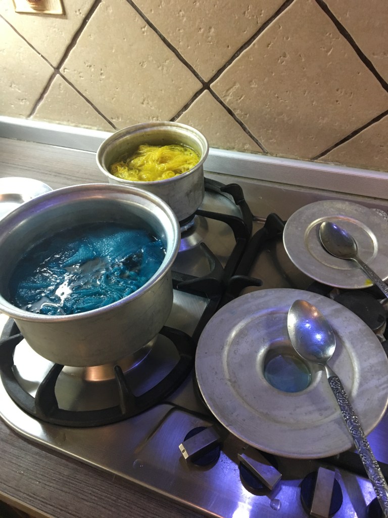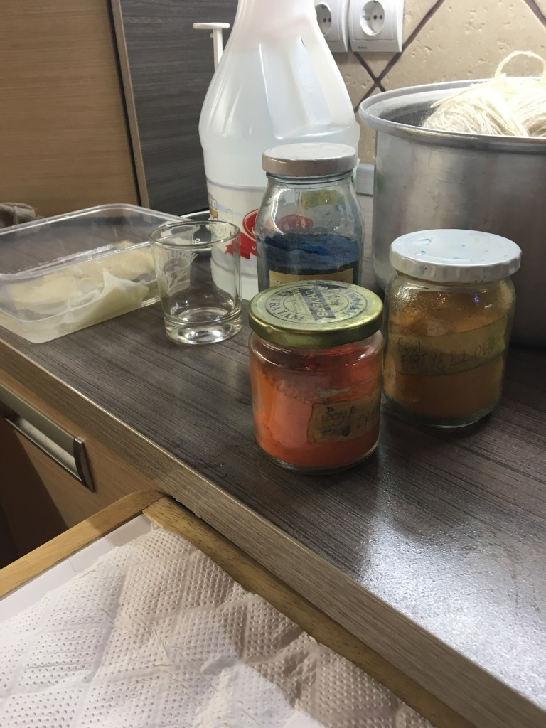 Safety in the dye lab is an absolute requirement for all dyeing activity whether it be in your own kitchen , in an educational establishment or in a factory . Personal safety as in exposure to chemical particles from dye and mordant substances can be dangerous for the skin and also inhaling therefore the lungs and throat. Wearing a protective face mask , preferably the N95 mask will prevent any inhalation and must be worn when handling all kinds of chemical substances. Protective gloves and protective glasses are also a requirement . I personally do not use protective glasses but I am only dyeing in small quantities but exposure to chemicals can cause irritation and burning to the skin and eyes .Protective gloves should be latex as thick washing up gloves can make you clumsy …and you do not want that when you are dealing with boiling dye baths and chemicals.