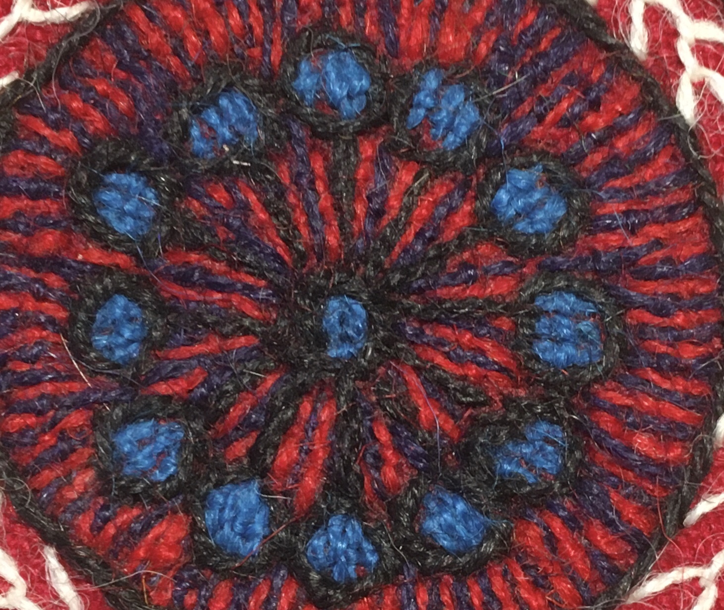 This is a design project inspired by Christine Chester for the Lockdown Stitch Challenge http://www.textileartist.org . I really enjoyed it .I took the opportunity to use it as a continuation of my research on embroidery on wool and would like to explain the colour choices! Pateh Doozi , an Iranian needlework / folk art uses these 8 colours in certain combinations …. blue and red = purple etc…. I used them in the same way but with a modern twist.