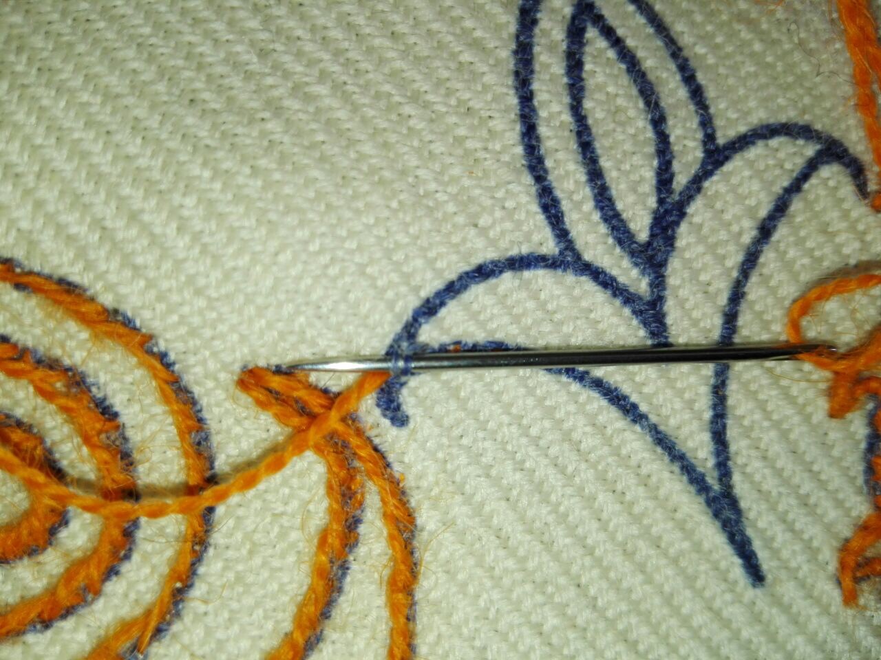 Dookht Jaadoui – magic stitch is done by twisting two yarns together and stitching the Ab Doozi stitch with them . It creates a very rich effect. For instance , making the first couch stitch in red and filling in the background with blue creates a purple effect .Twisting red and blue together and doing all the stitching with both creates the same but at twice the speed! It is considered cheating but personally I love it !