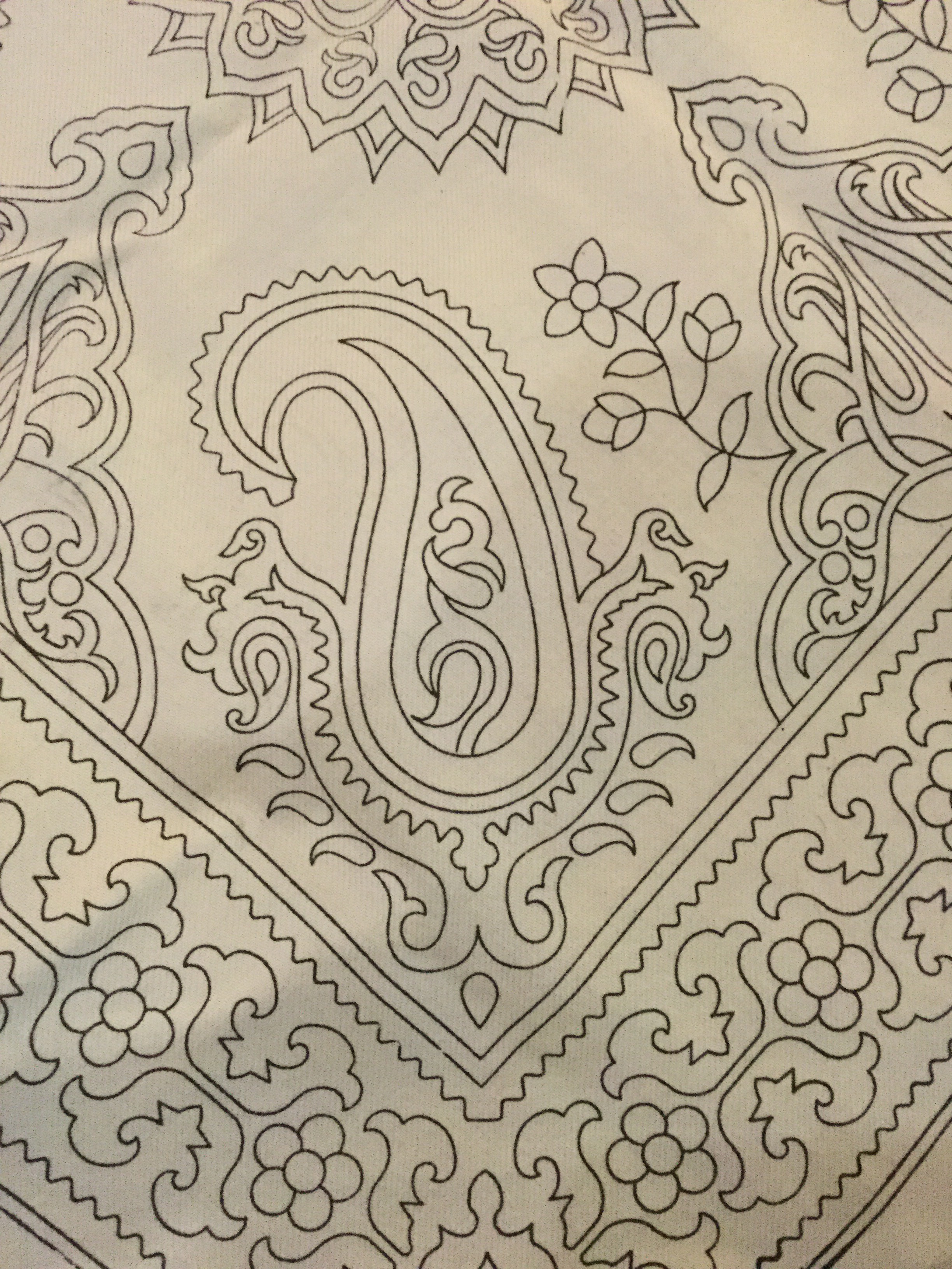 The circular designs are called Toranji and are either round or square pieces used for boghche , as wrap used for wedding gifts and for keeping precious things in . The pieces are also used as cushions, table cloths, especially for traditional occasions. Dark Pateh pieces are used for burial ceremonies either decoration or to place over the bodies.