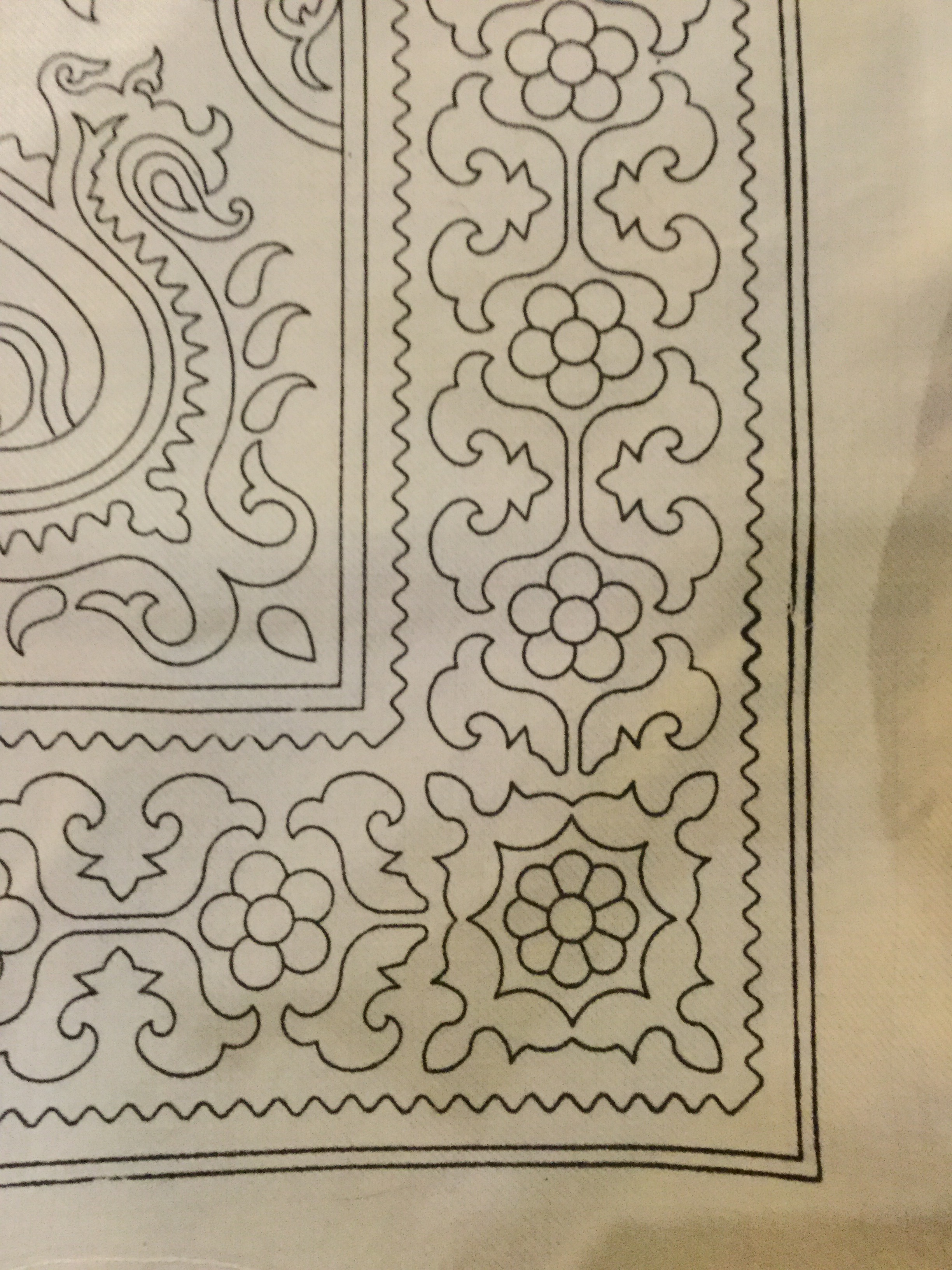 Packs are available in assorted colours and yarns from suppliers in Kerman . The designs are printed onto the fabric ready to sew. In the past the designs would have been transferred either freehand or with a stencil marked with charcoal. It is appropriate to wash both the fabric and the yarns before use. The black ink tends to spread during stitching so it is best to wash away the excess before hand. The yarns may bleed dye so washing before use will prevent running when the piece is cleaned.